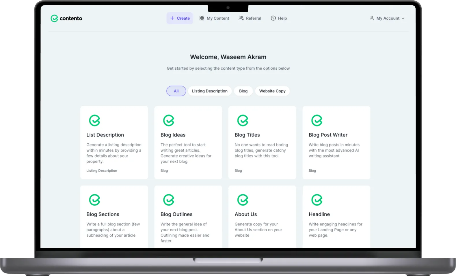 - Content Generation: Generate a variety of content, including listing descriptions, blog ideas, titles, sections, website copy, and ‘About Us’ sections.